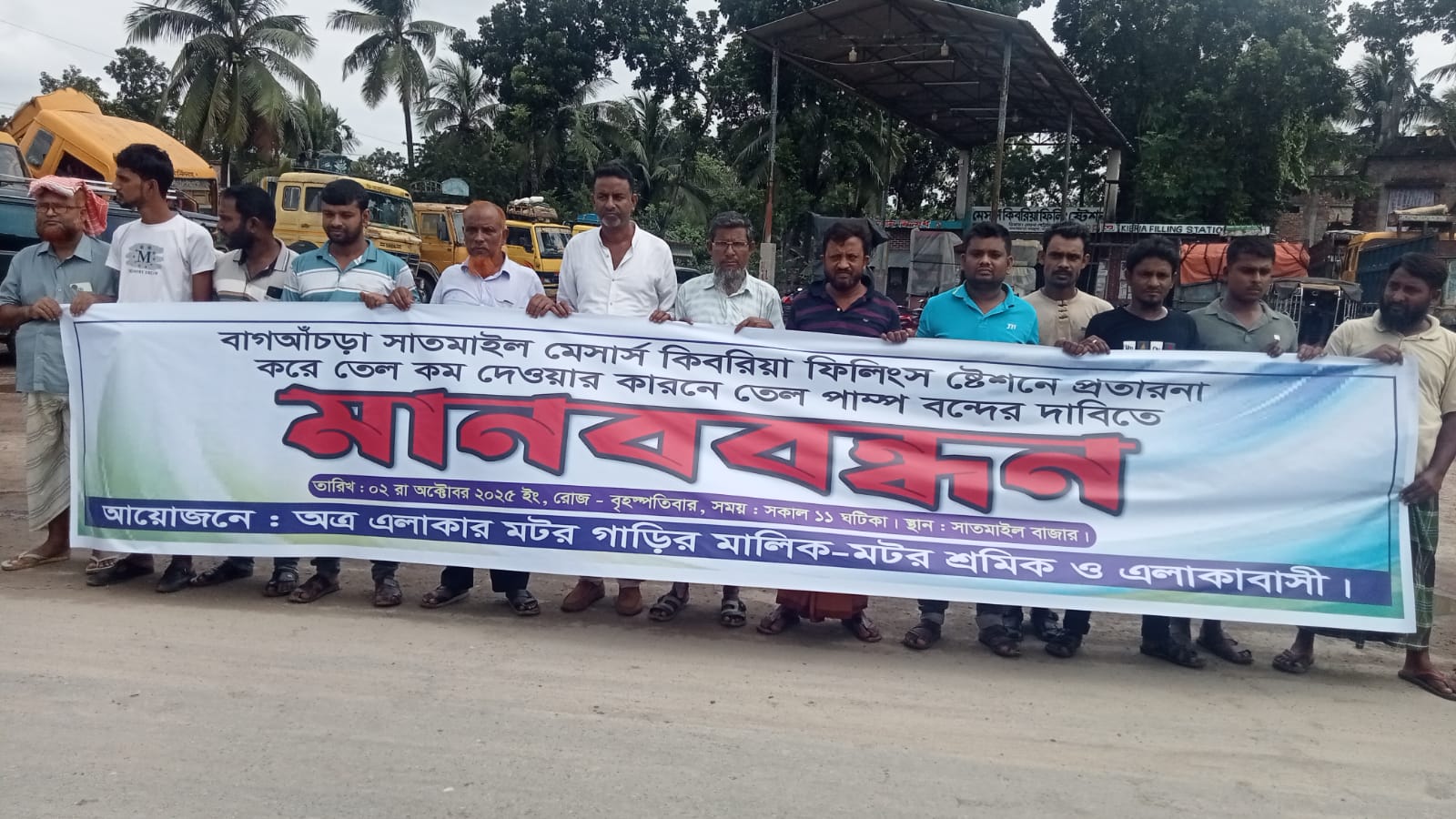 বৃহস্পতিবার (২ অক্টোবর) সকাল ১১ টার সময় ওই ফিলিং ষ্টেশনের সামনে এ মানববন্ধন অনুষ্ঠিত হয়। এসময় তেল কম দেওয়ার অভিযোগ তুলে ঐ ফিলিং স্টেশনটি বন্ধের দাবী জানান মানববন্ধনে অংশগ্রহণকারীরা।