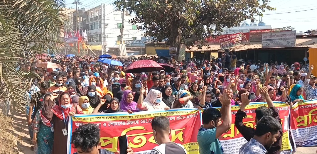 ঢাকাঃ আশুলিয়ায় কানাডিয়ান কম্পানি গিল্ডেন গ্রুপের অব্যবস্থাপনায় গর্ভবতী নারী শ্রমিক তাজমিনা খাতুনের মৃত্যুর প্রতিবাদে টানা পঞ্চম দিনে সমাবেশ শেষে বিক্ষোভ