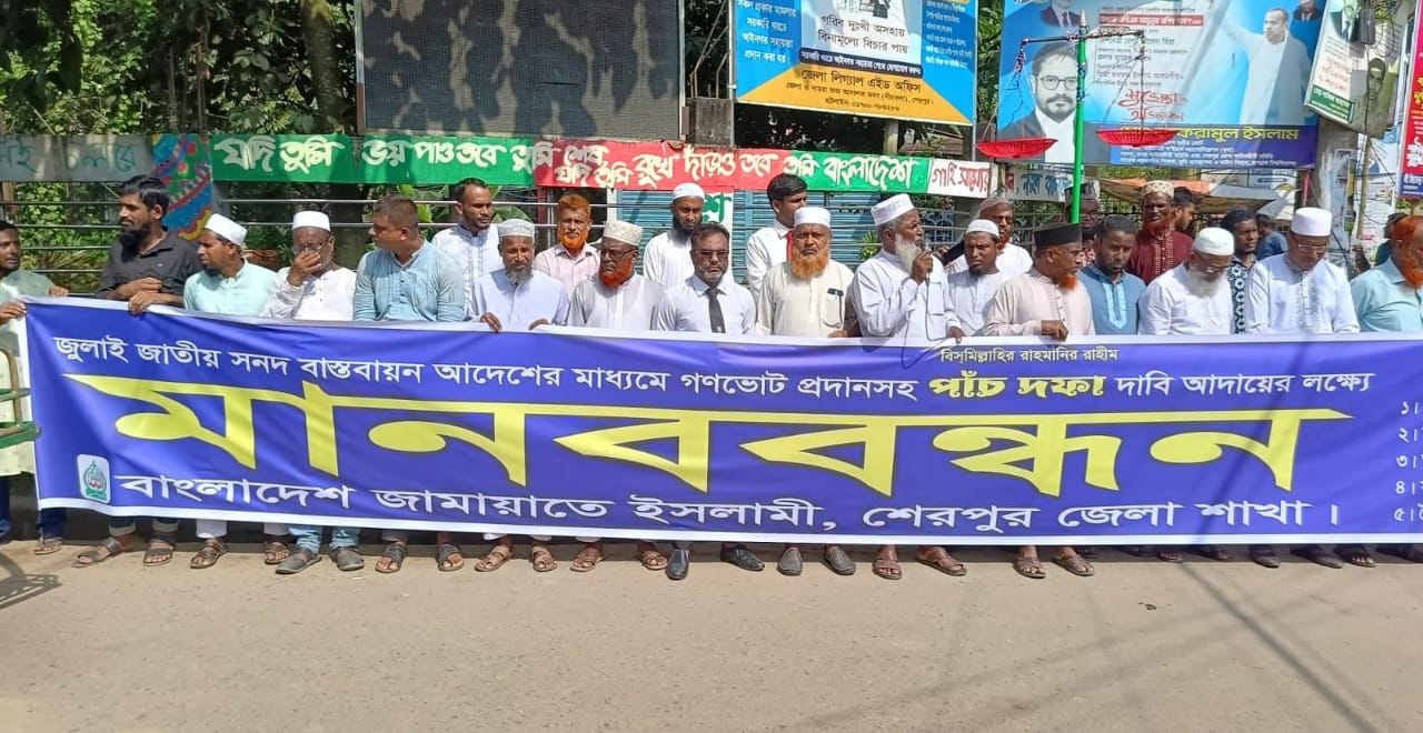 শেরপুরে জুলাই জাতীয় সনদ বাস্তবায়নসহ পাঁচ দফা দাবী আদায়ের লক্ষ্যে জামায়াতের মানববন্ধন