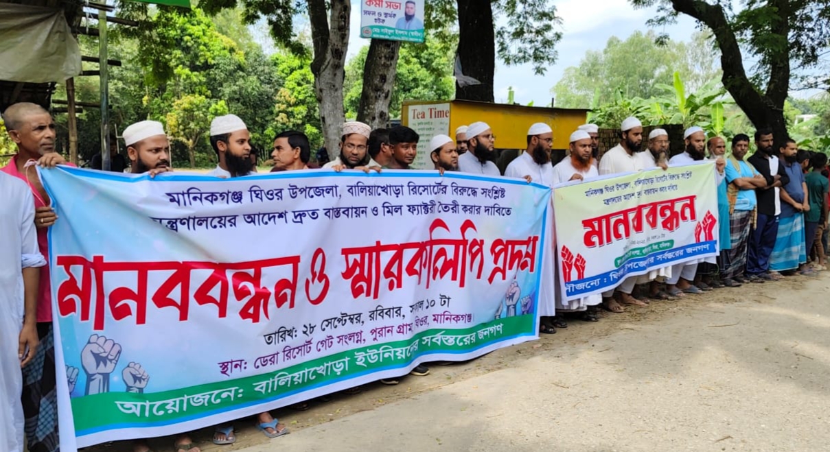 মানিকগঞ্জে ডেরা রিসোর্ট বন্ধে মন্ত্রণালয়ের আদেশ দ্রুত বাস্তবায়নের দাবীতে মানববন্ধন, বিক্ষোভ