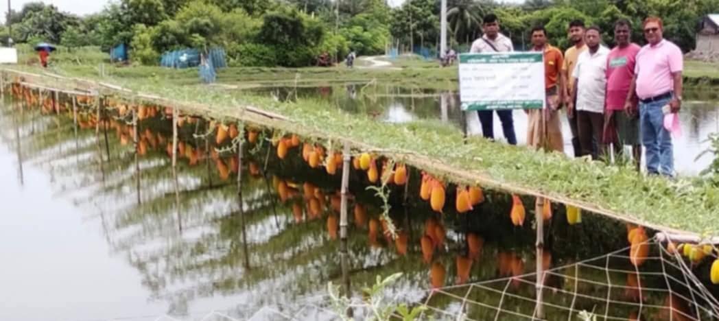 সাতক্ষীরাঃ সাতক্ষীরার দেবহাটা উপজেলার কুলিয়া ইউনিয়নের শশাডাঙ্গায় মৎস্য ঘেরের ভেড়ীতে মাচা তৈরি করে সুপ্রিমহানি জাতের তরমুজ চাষ করে এক কৃষক