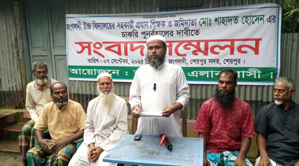 শেরপুরে জঙ্গলদী উচ্চ বিদ্যালয়ের সহকারী প্রধান শিক্ষকের চাকরি পুনর্বহালের দাবিতে সংবাদ সম্মেলন
