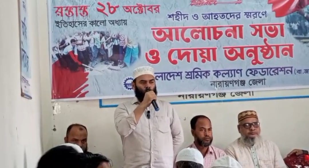 রক্তাক্ত ২৮ অক্টোবর শহীদ ও আহতদের স্মরণে নারায়ণগঞ্জে বাংলাদেশ শ্রমিক কল্যাণ ফেডারেশনের আলোচনা সভা ও দোয়া