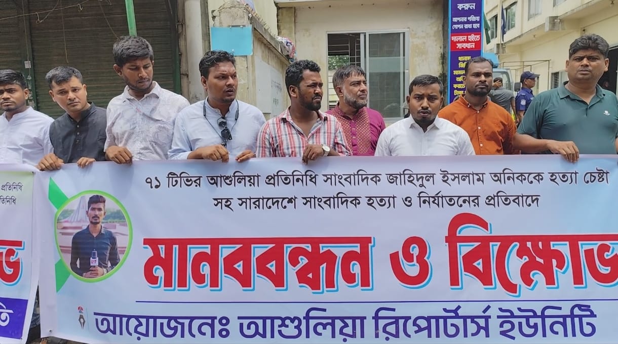 শনিবার (১৬ আগস্ট) দুপুরে আশুলিয়া থানার প্রধান ফটকের সামনে সাভার উপজেলা সাংবাদিক সমিতি ও আশুলিয়া রিপোর্টার্স ইউনিটির উদ্যোগে এই প্রতিবাদ সমাবেশ অনুষ্ঠিত হয়। এসময় আশুলিয়া থানার অফিসার ইনচার্জ এম আব্দুল হান্নান মানববন্ধনে সংহতি প্রকাশ করেন।