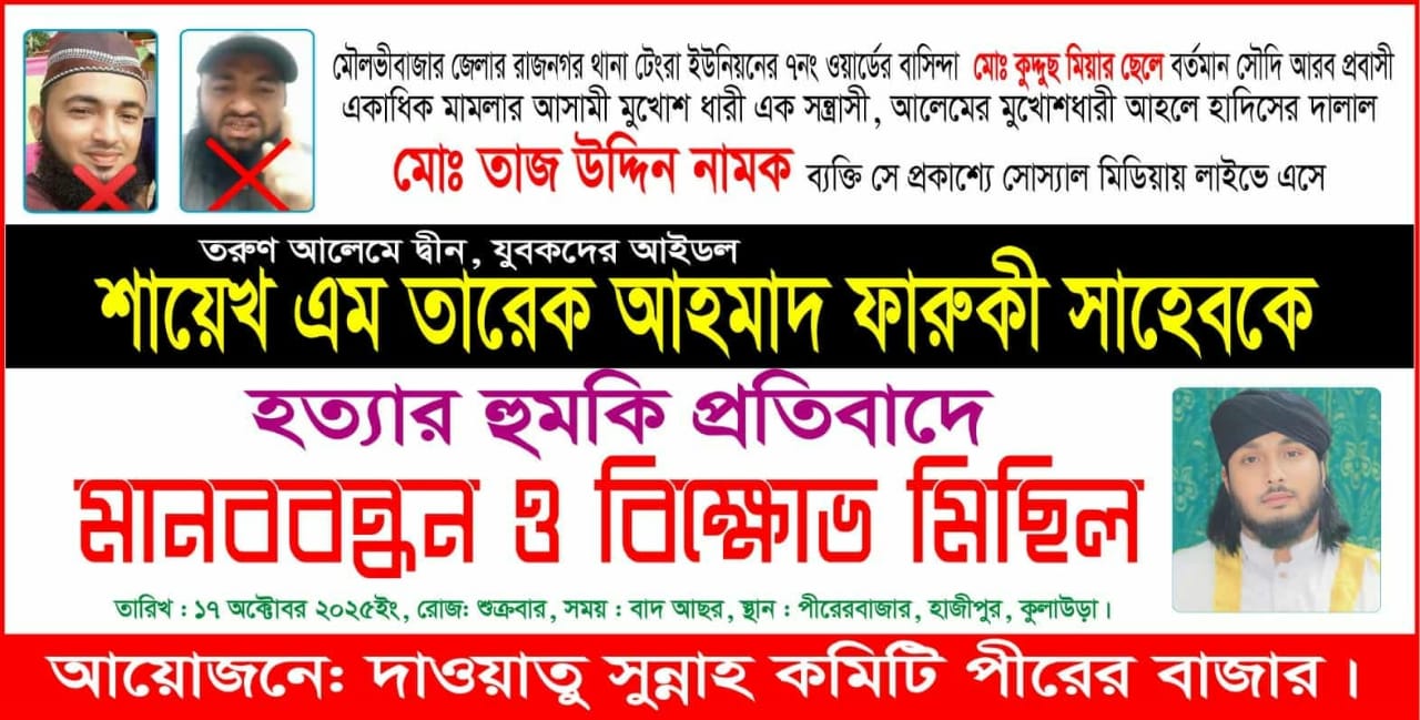 মৌলভীবাজারঃ গত ৮/১০/২০২৫ ইং তারিখে তরুণ আলেমে দ্বীন সারা বাংলার আলোড়ন সৃষ্টি কারী বক্তা এম তারেক আহমাদ ফারুকী সাহেব উনি উনার আইডি তে একটি গজল আপলোড দেন তার পর মৌলভীবাজার জেলার রাজনগর থানার টেংরা ইউনিয়নের ৭ নং ওয়ার্ডের বাসিন্দা মোঃ কুদ্দুছ মিয়ার ছেলে বর্তমান সৌদিআরব প্রবাসী একাধিক মামলার আসামী আলেমের মুখোশধারী এক সন্ত্রাসী মোঃ তাজ উদ্দীন নামক ব্যক্তি সে ঐ পোষ্টে এসে অনর্থক কমেন্ট করে তার কমেন্টের উক্তর দেওয়াকে কেন্দ্র করে সে বিকালে ফারুকী সাহেবের পিক দিয়ে তার আইডিতে অশালীন এবং হুমকি দিয়ে পোষ্ট করে। আবার ঐ ব্যক্তি রাত্রে তার আইডিতে সরাসরি ভিডিও আপলোড করে এবং ভিডিও তে সরাসরি ফারুকী সাহেব কে হত্যার হুমকি দিয়েছে এবং আরও বলে সে যে সে মামলা প্রশাসন এগুলো ভয় পায়না।