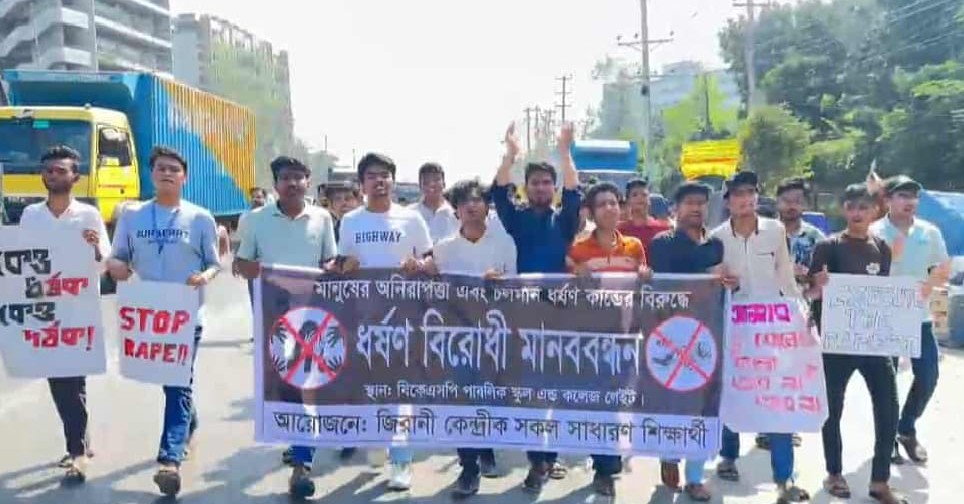 ঢাকাঃ সাভারে বিশ্ববিদ্যালয় ছাত্রী, গাজীপুরে ১৩ বছর বয়সী মাদ্রাসাছাত্রী এবং চলতি ও গত বছরে দেশব্যাপী ঘটে যাওয়া অজস্র ধর্ষণ ও নারী নির্যাতনের ঘটনার প্রতিবাদে আজ দুপুর ১২ টায় জিরানী বাজারের বিকেএসপি পাবলিক স্কুল এন্ড কলেজের সামনে অনুষ্ঠিত হয়েছে মানববন্ধন ও প্রতিবাদী মিছিল।