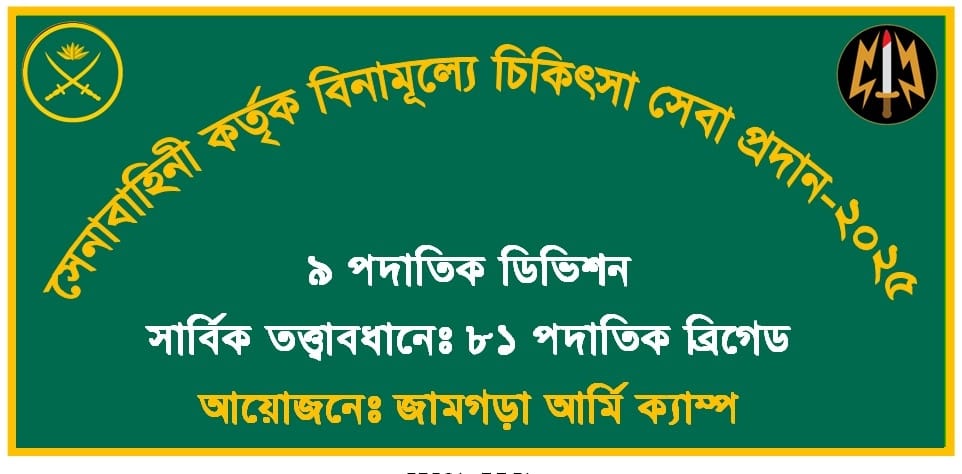বুধবার (২৯ অক্টোবর) সকাল ৯টা থেকে বিকেল ৪টা পর্যন্ত আশুলিয়ার, সামাজিক কনভেনশন হলে বাংলাদেশ সেনাবাহিনী ৯ পদাতিক ডিভিশনের তত্ত্বাবধানে জামগড়া আর্মি ক্যাম্পের সার্বিক ব্যবস্থাপনায় বাংলাদেশ সেনাবাহিনী কর্তৃক বাইপাইল, ভাদাইল, নরসিংহপুর, আশুলিয়া, জিরাবো, ইয়ারপুর, বাগবাড়ি, তৈয়বপুর, ইউসুফ মার্কেট এবং কাশিমপুর, এলাকার দুস্থ ও অসহায় ব্যক্তিদের বিনামূল্যে চিকিৎসা সেবা ও ঔষধ প্রদান করা হবে। উল্লেখ্য যে, উক্ত দিনে মেডিসিন, শিশু, চক্ষু, চর্ম ও যৌন, স্ত্রীরোগ ও ধাত্রীবিদ্যা, নাক, কান ও গলার বিশেষজ্ঞগন চিকিৎসা সেবা প্রদান করবেন।